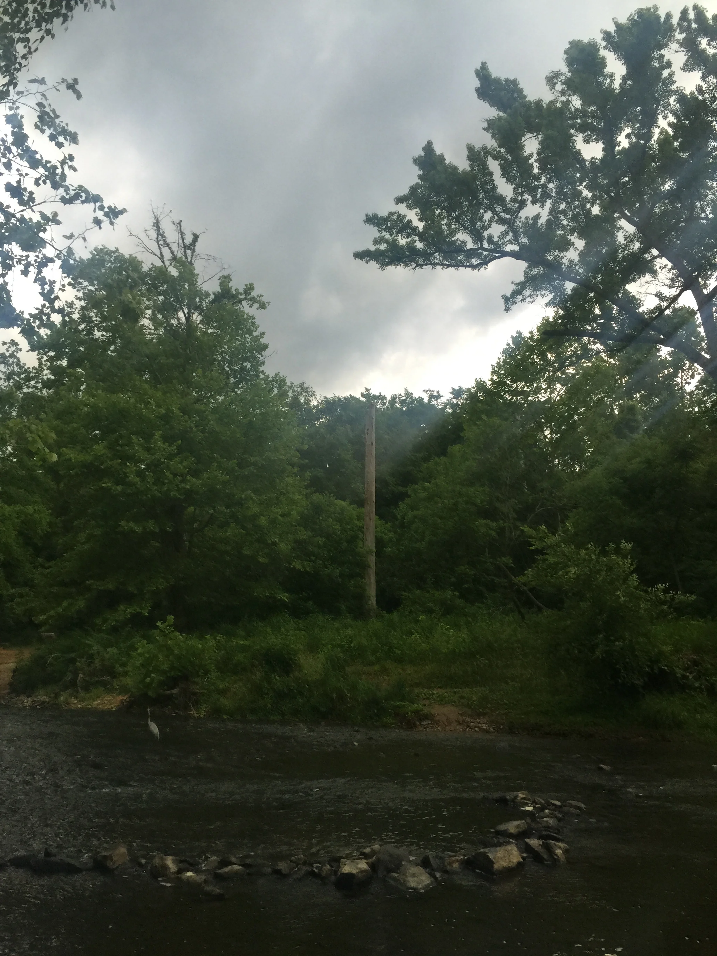 The sky opened up and the woods howled with thunder and rain. I found a dead turtle by the water and a blue heron kept pace with me as I climbed over rocks and slippery slopes towards my campsite.
